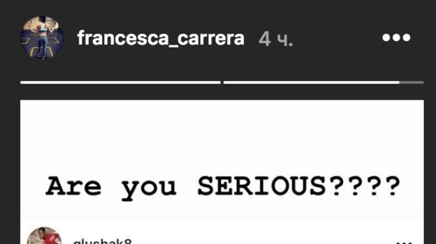 В комментарии к посту Глушакову она написала: "Ты серьезно?????" Ту же фразу она написала и в сториз, куда выложила скрин поста хавбека красно-белых.