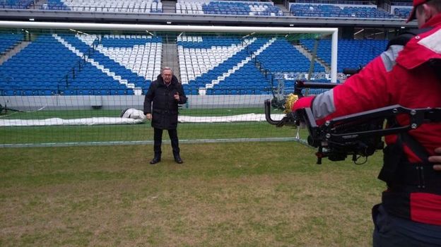 Сегодня в первой половине дня поле находилось под специальным покрывалом, защищающим от снега. А вот на прошлой неделе газон был открыт. И пресс-служба УК "Динамо" опубликовала в соцсетях несколько фотографий. В частности, на поле побывал известный артист Юрий Стоянов.