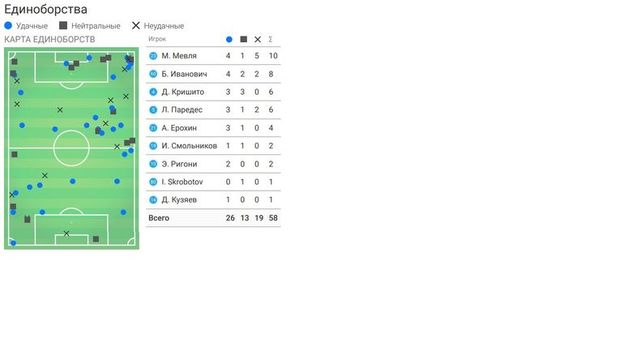 Главная характеристика полезности Дзюбы в этом матче. Артем здорово боролся за мяч. Он принял участие в 58 единоборствах в этой игре. Второе место по этому показателю у его визави Антона Заболотного (29). Но форвард "Зенита" выиграл всего девять из них, а Дзюба – 29!