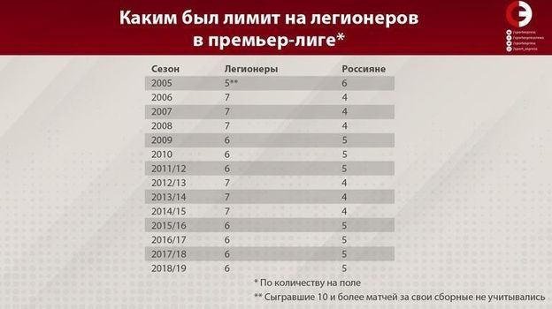 2. В декабре 2017 года исполком РФС (президент Виталий Мутко) постановил ввести с сезона-2020/21 лимит на легионеров по максимальному числу иностранцев в заявке на сезон – 7 или 8. Определить число и представить его на рассмотрение исполкому было поручено комитету профессионального футбола.