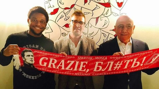 Я попросил Трабукки, который участвовал в сделке по бразильскому форварду "Милана", рассказать историю знаменитого фото, на котором Луиз Адриану, только что подписавший контракт со "Спартаком", Каррера и генеральный директор "россонери" Адриано Галлиани растягивают шарф "Спартака" с культовой цитатой Дмитрия Комбарова: "Grazie, б...ь!".