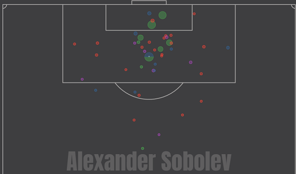 Соболев же в первой половине сезоне зажигал в «Крыльях». Он был (и остается) лучшим бомбардиром команды в РПЛ (10), а также лидером по созданным моментам: 7,27 xG. Александр в среднем наносил 2,49 удара за 90 минут — преимущественно из пределов штрафной площади: