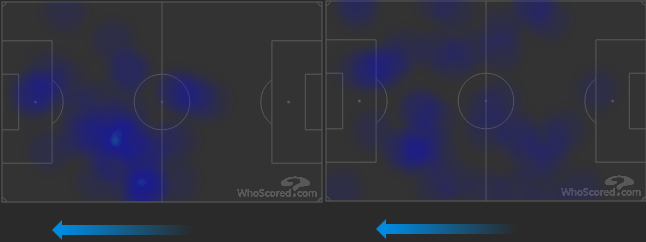 Слева — действия Соболева в матче 16-го тура РПЛ «Спартак» — «Крылья Советов» (2:0). Играя за самарский клуб, он почти не опускался на свою половину поля, ожидая возможности зацепиться за мяч в финальной трети. Справа — позиция Соболева в игре 22-го тура РПЛ «Оренбург» — «Спартак» (1:3). Александр перемещался по всему полю, отрабатывая в прессинге и помогая начинать атаки.