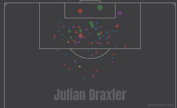 Что касается завершения, то Дракслер хорош в штрафной. Издали немец бьет не так часто и куда менее успешно. Рабочая нога у Юлиана — правая, но футболист может забить и левой, а также головой. Главное — его открывания вблизи ворот соперника, а также подключения к атакам вторым темпом.