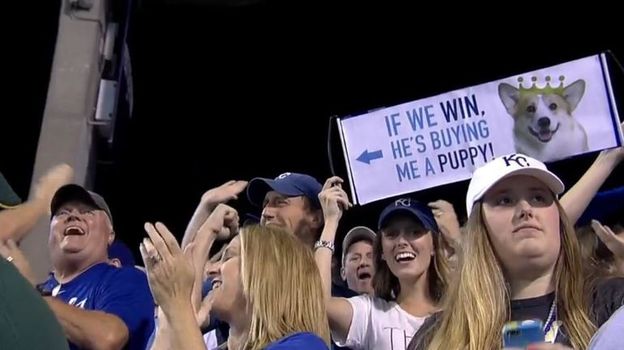 Очень часто девушки ставят ультиматум своим парням. Так было в Канзасе, когда местная бейсбольная команда играла с "Оклендом". Одна из фанаток "Канзас Сити" Кэти пришла на матч со своим парнем и плакатом: "Если мы победим, он купит мне щеночка". "Канзас" победил, а американские СМИ еще долго рассказывали эту историю, закончившуюся тем, что у пары появилась симпатичная собачка.