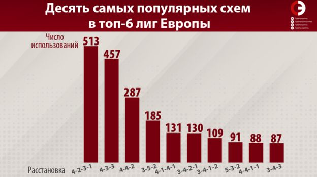 Но футбол достиг той стадии, когда все возможные расстановки уже изучены. Никто не будет сознательно с первых минут ставить восемь защитников или восемь нападающих, а при этом разница между двумя и тремя полузащитниками огромна. Мы решили выяснить, какую именно расстановку чаще всего используют клубы высших лиг в Европе и в чемпионате России. За основу взяты данные Opta.
