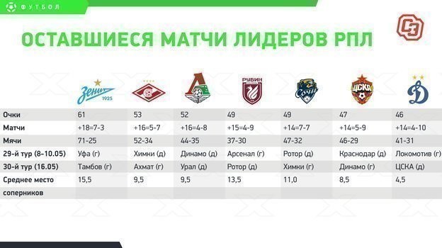 Обновление раскладов для группы лидеров РПЛ за спиной «Зенита». В предыдущем, 28-м туре клуб из Санкт-Петербурга (61 очко) досрочно выиграл новое золото, после чего «Спартак» (53 очка) обошел «Локомотив» (52) в споре за серебро и второе место в Лиге чемпионов (в отборочном турнире). Дальше идут «Рубин» и «Сочи» (по 49 очков), ЦСКА (47) и «Динамо» (46). Формально только бело-голубые больше не имеют никаких шансов в лигочемпионской гонке.