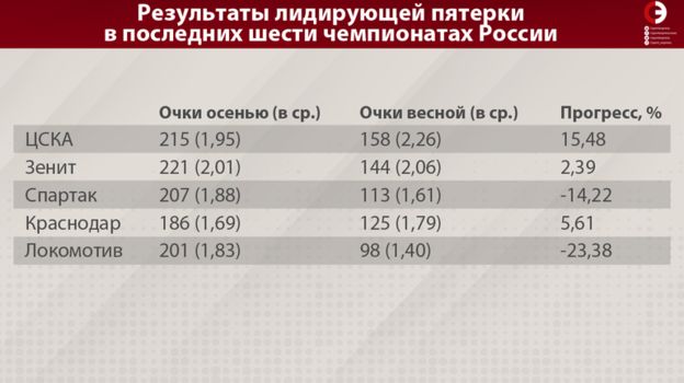 Лучше всех весенняя часть чемпионатов России в последние годы дается московским армейцам. В чемпионате России-2013/14 весенний рывок позволил отыграть девятиочковый отрыв от "Локомотива" и выиграть золото. Еще дважды финишный спурт позволял занимать второе место (2016/17, 2017/18). В остальных трех случаях ЦСКА сохранял необходимое преимущество, добытое осенью. Два раза этого хватило для чемпионства (2012/13, 2015/16) и один раз выиграть серебро (2014/15).