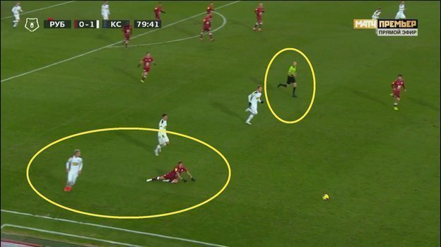 На 80-й минуте Москалев совершил ключевую ошибку, удалив полузащитника гостей Антона Зиньковского. Это действительно ошибка — в отличие от ситуации с Кварацхелией, игроком «Рубина», который намного раньше покинул поле.