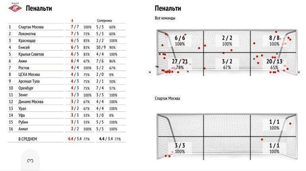 Железнодорожники, а также "Спартак", чаще других в этом сезоне били пенальти – по 7 штук. Разве что красно-белые реализовали все семь попыток, а игроки "Локо" – только пять. Реже всех 11-метровые в завершившимся чемпионате России исполняли футболисты "Ахмата" (2 раза).