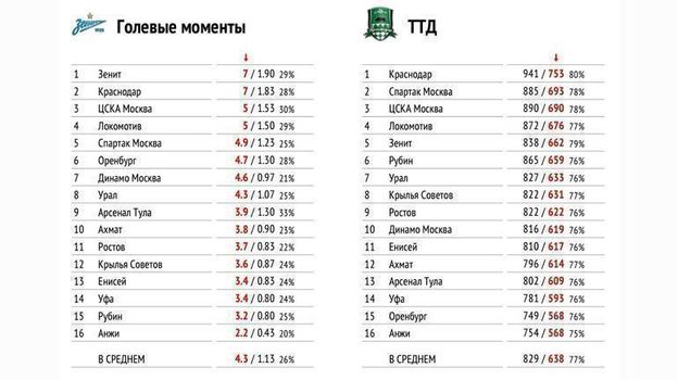 Также "Краснодар" – первый по технико-тактическим действиям (все передачи, единоборства, перехваты, подборы, ведение мяча, неудачные обработки мяча, удары по воротам, отбитые удары и пропущенные голы) – у "быков" таких 941 за игру, из них 753 (80%) – удачных. Следом по ТТД с большим отрывом – ЦСКА (890 всего/690 удачных) и "Спартак" (885/693).