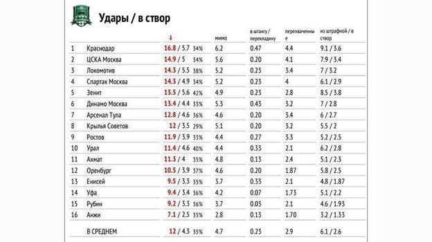 При разборе компонентов игры большинство пунктов – за "Краснодар", который в итоге оказался на третьем месте. Так "быки" идут в лидерах и по общему количеству ударов (16,8 в среднем за матч), и по ударам непосредственно в створ (5,7). С приличным отрывом ниже ЦСКА (14,9), "Локомотив" (14,3), "Спартак" (14,3) и "Зенит" (13,5). Интересно, что шестое в этом списке – "Динамо" (13,4). В среднем в РПЛ бьют по воротам 12 раз за матч, из них в 35 процентах случаев мяч долетает до створа.