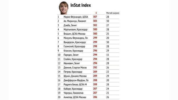 Лучший футболист сезона по версии InStat – защитник ЦСКА Мариу Фернандес. Его индивидуальный индекс составил 307. Также в пятерке – полузащитник "Локомотива" Алексей Миранчук (303), нападающий "Зенита" Артем Дзюба (302), защитник "Краснодара" Александр Мартынович и еще один игрок ЦСКА Никола Влашич (оба – по 300). При этом единственный среди них, кто принял участие во всех матчах чемпионата, это Миранчук, у защитника сборной России на две встречи меньше.