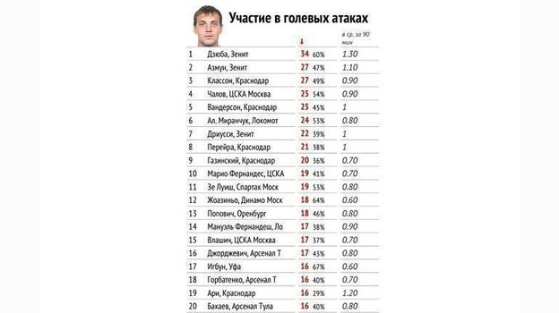 Чалов не зря стал лучшим бомбардиром чемпионата: он бил чаще других, 93 раза, и 46 из этих ударов достигало створа. Это намного больше, чем у любого другого футболиста премьер-лиги. Звание лучшего ассистента – за Дзюбой (11 голевых передач). Кроме того, форвард "Зенита" принял участие в наибольшем количестве голевых атак – 34, у Чалова таких только 25.