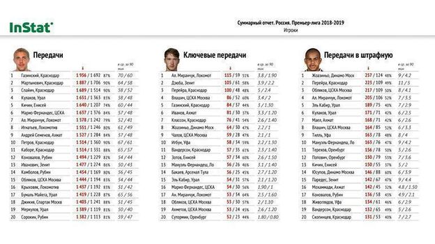 Сразу три футболиста "Краснодара" лидируют по количеству передач – Газинский (1956), Мартынович (1887) и Спаич (1689). Но по ключевым передачам лидер из другого клуба – "железнодорожник" Алексей Миранчук (115/59). Неожиданно больше всех передач в штрафную в лиге сделал полузащитник "Динамо" Жоаузинью (257/124). Защитник "Спартака" Дмитрий Комбаров не вошел даже в топ-20 игроков по количеству навесов в этом сезоне: первое место за Денисом Кулаковым из "Урала" – 151 (в среднем по 5 штук за 90 минут).