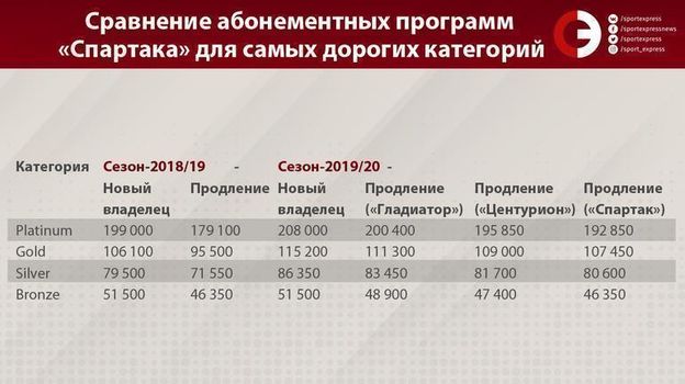 Команда заняла пятое место и едва опередила тульский "Арсенал" – тут тоже хвалиться нечем. Может быть, в такой ситуации болельщиков лучше вообще не трогать и предложить им те же цены на абонементы, что и в прошлом сезоне. Но повышение НДС (в частности) и, вероятно, стремление "Спартака" отбить затраты на строительство "Открытие Арены" (в целом) повлияли на ценовую политику абонементов в новом сезоне.