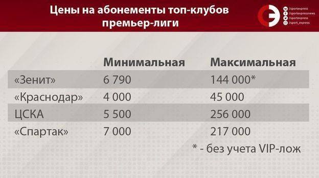 "Локомотив" абонементную программу пока не опубликовал, а у "Краснодара" уже все есть. Бронзовый призер минувшего чемпионата предлагает цены от 4 000 до 45 000 рублей. Конечно, Краснодар – не Москва и не Санкт-Петербург, но прейскурант "быков" все равно впечатляет. В прошлом сезоне минимальная цена абонемента на игры кубанцев составляла 3 500 рублей.