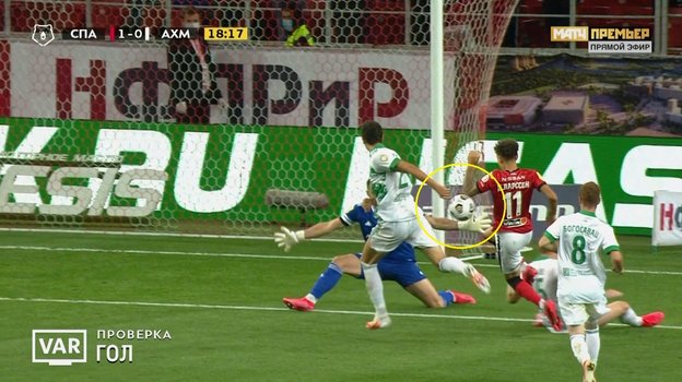 На 19-й минуте Турбин изменил свое первоначальное решение и не засчитал взятие ворот гостей. Сделал он это после вмешательства видеоарбитров. Они, изучив видеозапись голевой атаки, заметили, что перед ударом Джордана Ларссона по воротам «Ахмата» произошел контакт мяча с рукой спартаковского нападающего.