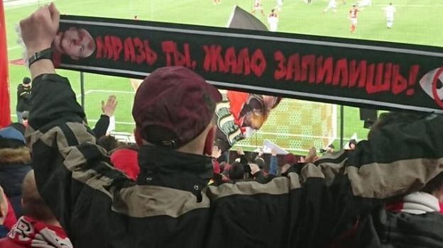– Мужчина (на вид – лет 30) развернул шарф с оскорбительной надписью о Глушакове – "Мразь ты, жало запилишь!" ("жало запилишь" сказал капитан "Спартака" жене Дарье на скандальной аудиозаписи).