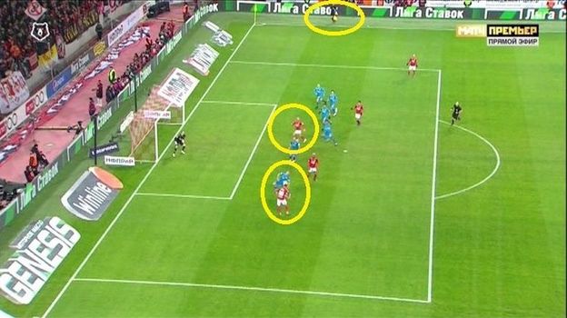 На 13-й минуте судья зафиксировал взятие ворот гостей, несмотря на их протесты. Зенитовцы считали, что автор гола Денис Глушаков в момент передачи Александра Ташаева оказался в положении "вне игры". Видеоповтор позволяет принять сторону судьи и его второго ассистента Максима Гаврилина: в момент паса партнера спартаковский капитан не забежал за линию офсайда, его перекрыл ногой Игорь Смольников.