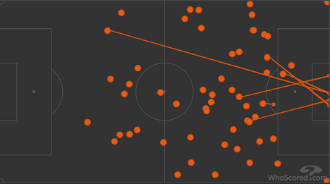 — традиционно использовал длинные передачи от центральных защитников (20 сделал Жиго, 15 — Джикия, а всего было выполнено 70 пасов подобного типа. Для сравнения: у ЦСКА — 50);