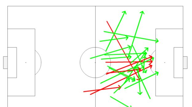 Нобоа сделал больше всех передач (76), проведя на поле лишь час – и его все равно не догнали партнеры. А 26 передач в финальную треть с точностью 77% – это лучший показатель после Ригони с 34 пасами в финальную треть, но с разницей, что аргентинец все-таки принимал мячи выше.