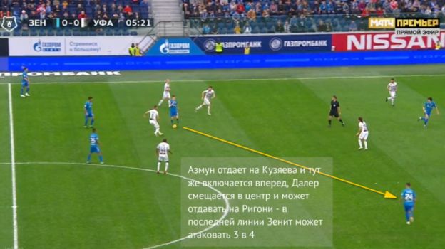 К примеру, так выглядит участие в позиционных атаках нападающих (когда отходит один, второй, соответственно, остается на острие – чаще отходит Дзюба). В данном случае стоит отметить опять же действия Нобоа и его свободу при приёме паса – "Уфа" лишь обозначала давление, и эквадорец спокойно развернулся в сторону чужих ворот и отдал передачу. Несмотря на неплохую идею среднего блока в 5-2-3 от "Уфы", что позволяет накрывать соперника 3 в 3 при начале атак и закрывать линию паса на опорника, команде Кириченко однозначно не хватило интенсивности прессинга.