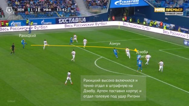 Любопытно, что голевая комбинация началась по схожему принципу – Нобоа нашел между линиями Азмуна, который оставил мяч Кузяеву, и "Зениту" удалось установить владение в финальной трети. Дальше последовало хорошее включение Ракицкого – украинец отдал предголевой пас.