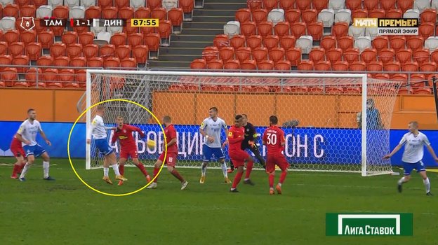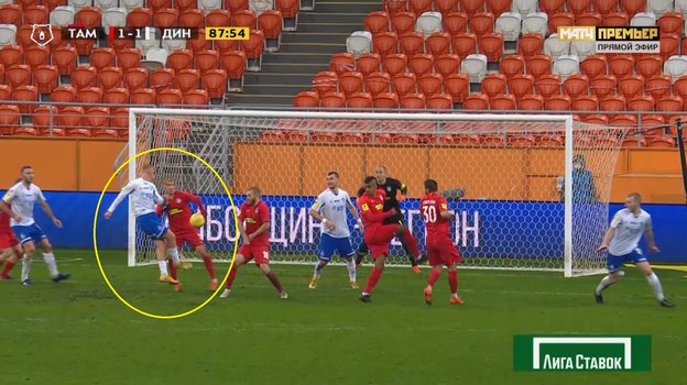 На 88-й минуте в штрафной площади «Тамбова» произошел контакт мяча с левой рукой Евгения Шлякова. Он отскочил в руку от корпуса игрока. Динамовцы стали требовать пенальти, но Карасев не остановил матч.