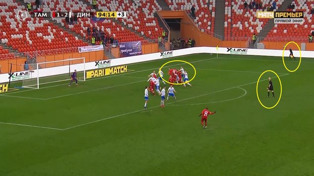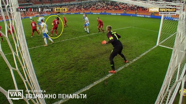 С 90+5-й по 90+8-ю минуту видеоарбитрам и Карасеву пришлось снова вглядываться в экраны мониторов. Уже в штрафной площади «Динамо» произошло единоборство Комличенко и Адесойе Ойеволе, в результате которого игрок «Тамбова» упал. Мяч находился в игре. Опять встал вопрос о назначении пенальти.