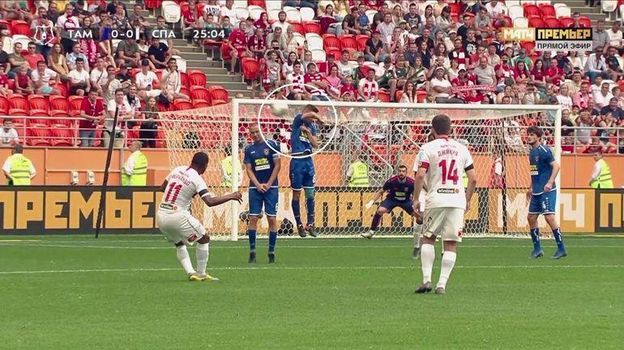 На 35-й минуте Вилков принял совершенно верное решение, не назначив 11-метровый удар в ворота тамбовской команды. Кому-то могло показаться, что Таказов в падении рукой прервал прострельную передачу Рассказова. На самом деле мяч попал игроку "Тамбова" в спину. Это видно на повторе, показанном пять минут спустя. Оснований для назначения пенальти нет.