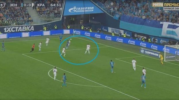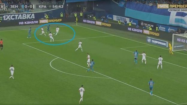 57-я минута игры. Жирков был на фланге один против троих, но применил свое фирменное жонглирование мячом, вошел в штрафную и отдал точную передачу на Дзюбу, (Артем не смог обработать передачу). Юрий за счет индивидуальных качеств превратил заурядную позиционную атаку в опасный момент.