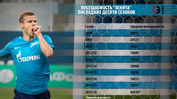 Почти 45 тысяч зрителей на матчах "Зенита" – результат, вполне сопоставимый с тем, что демонстрируют команды Англии и Германии. В прошлом сезоне "Спартак" (32 760 зрителей) не смог побить рекорд "Алании" 1995 года (35 046 зрителей), но сейчас можно не сомневаться – рекорд владикавказцев не устоит.