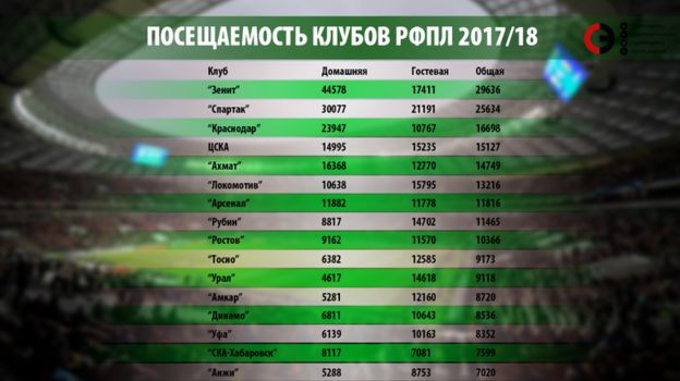 Из остальных команд следует отдельно отметить по-прежнему высокую посещаемость "Краснодара". Спортивный результат команды пока не выходит на новый уровень, но в среднем 25 тысяч на каждом матче – результат, достойный уважения.