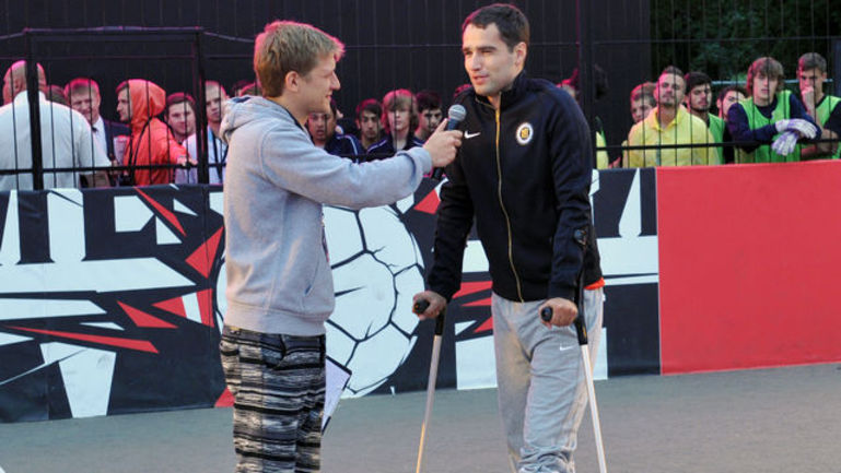 Полузащитник сборной России Роман Широков, пропустивший ЧМ-2014 из-за травмы, стал специальным гостем турнира по уличному футболу на асфальтовом покрытии, который проходит в ЦПКиО им. Горького. Хавбек вышел на площадку на костылях и ответил на несколько вопросов ведущего.