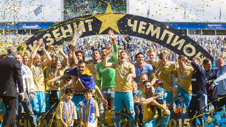 После победы над "Локомотивом" футболистам "Зенита" вручили чемпионский Кубок, и команда Виллаш-Боаша отметила победу в чемпионате страны.