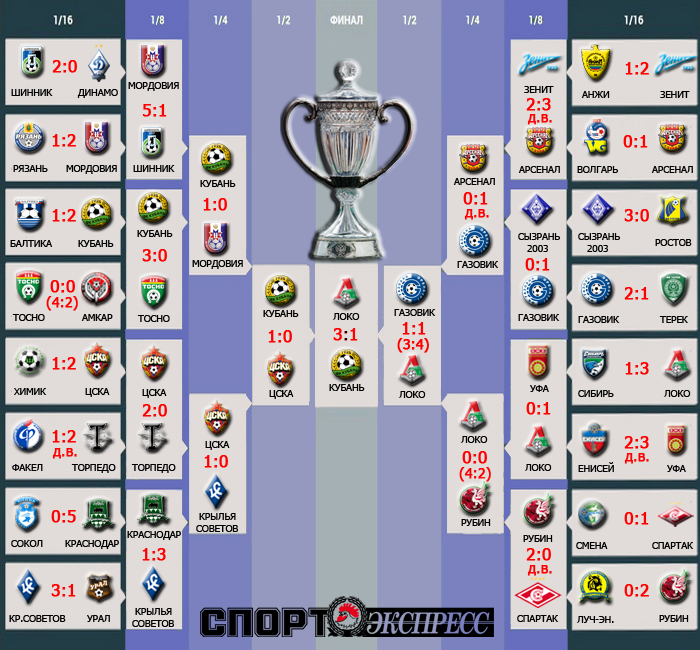 "Локомотив" в финале Кубка России в дополнительное время победил "Кубань" со счетом 3:1. Счет в матче открыли краснодарцы – на 28-й минуте отличился Владислав Игнатьев. На 73-й минуте счет сравнял Умар Ньясс. В дополнительное время 6-й Кубок России "Локомотиву" принесли голы Мубарака Буссуфы и Алексея Миранчука. Правда, победный мяч железнодорожников был засчитан ошибочно.