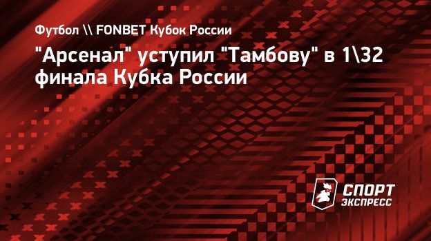 В матче 1/32 финала Кубка России "Арсенал" проиграл "Тамбову" - 0:1. В других встречах ижевский "Зенит" разгромил "КАМАЗ" - 3:0, а тверская "Волга" взяла верх над "Балтикой" - 1:0. Потенциальными соперниками "Тамбова" в 1/16 финала являются "Ростов", "Урал", "Анжи" и "Крыльев Советов". Ижевский "Зенит" и тверская "Волга" могут встретиться с "Зенитом", ЦСКА, "Краснодаром" или "Динамо".