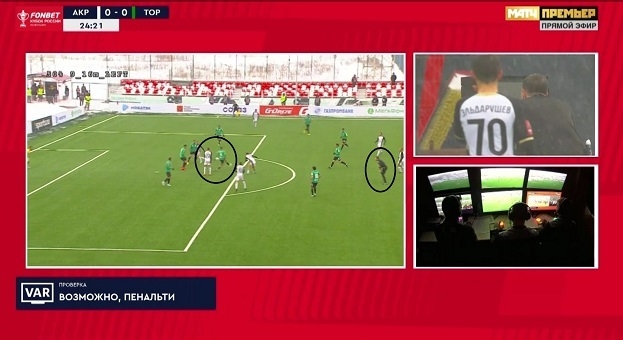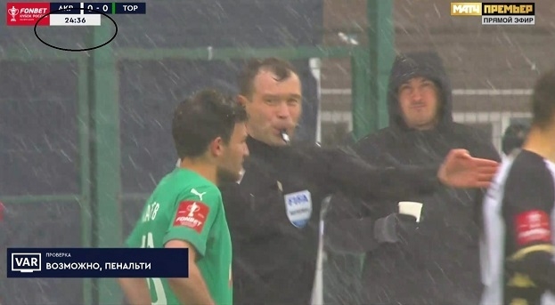 На 20-й минуте четвертьфинального матча FONBET Кубка России «Акрон» — «Торпедо» в штрафной площади гостей произошел контакт мяча с левой рукой торпедовца Олега Кожемякина. Арбитр Артем Любимов поначалу пенальти ошибочно не назначил.