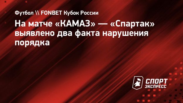 Во время матча 1/16 финала Кубка России «КАМАЗ» — «Спартак» (1:2) было выявлено два факта нарушения общественного порядка, информирует пресс-служба МВД по Республике Татарстан.