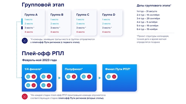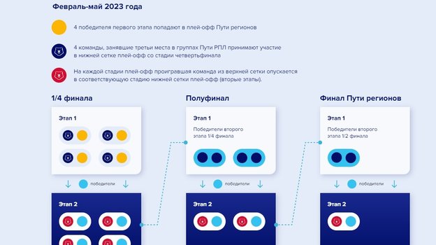 Плей-офф «Пути регионов»: 4 победителя первого этапа попадают в плей-офф «Пути регионов». 4 команды, занявшие третьи места в группах «Пути РПЛ» принимают участие в нижней сетке плей-офф со стадии четвертьфинала.