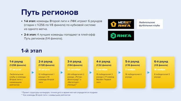 1-й этап: команды второй лиги и ЛФК играют 6 раундов (стадии с 1/256 по 1/8 финала) по кубковой системе из одного матча.