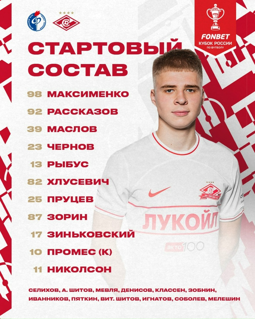 В составе красно-белых дебютирует 18-летний полузащитник Даниил Зорин. Капитаном красно-белых будет Квинси Промес, защитник Георгий Джикия не попал в заявку и пропустит игру.