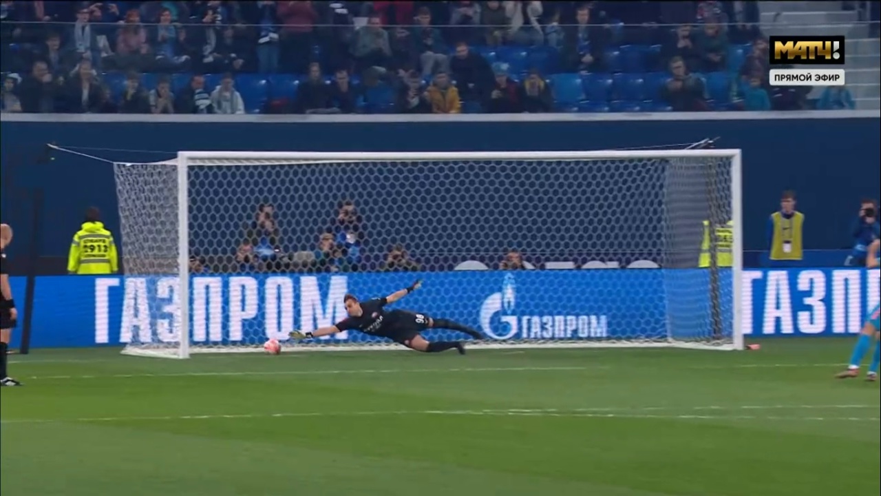 Мостовой подходит к точке и кладет мяч в левый угол — Максименко угадал, но не дотянулся. 3:1 по пенальти уже в пользу «Зенита».