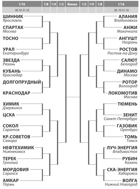 Вчера прошла жеребьевка 1/16 финала Кубка России. На этой стадии турнира в борьбу вступают клубы премьер-лиги, все они сыграют в гостях. Матчи пройдут 30-31 октября.