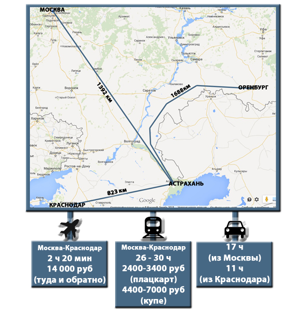 Расстояние до Астрахани от Москвы – 1392 км, от Краснодара – 823 км, от Оренбурга – 1688 км (но это с учетом, что придется объезжать Казахстан).