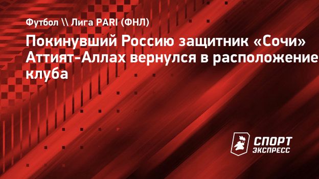 Генеральный директор «Сочи» Дмитрий Рубашко в комментарии для «СЭ» сообщил, что защитник Яхья Аттият-Аллах вернулся в расположение команды. После сборов в Санкт-Петербурге игрок исчез, не полетев с командой в Екатеринбург на матч против «Урала».
