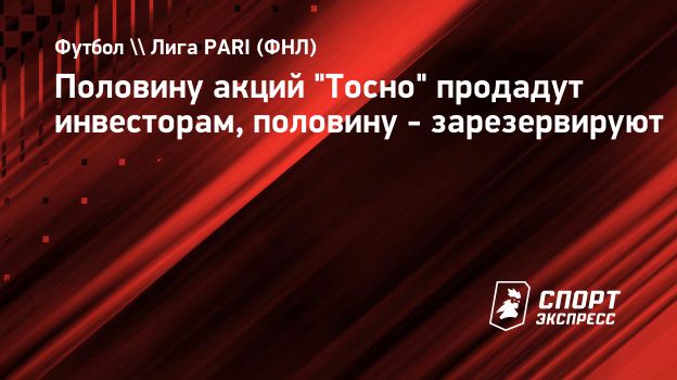 Около 50 процентов акций "Тосно" после завершения процесса акционирования планируется разделить между двумя-тремя инвесторами. Вторую половину акций зарезервируют до возвращения клуба в премьер-лигу, сообщает ТАСС со ссылкой на пресс-службу правительства Ленинградской области.