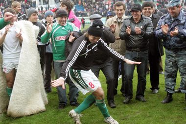 После того как Магомедов сделал счет крупным, зрители уже не садились. Стадион бушевал, а с приближением финального аккорда фанаты "Дикой дивизии" принялись распевать любимое: "Оле, оле, "Анжи" вперед!" Когда же матч закончился, старшие по возрасту поклонники махачкалинской команды появились на поле в дагестанских бурках, которые были вручены каждому из игроков "Анжи". А дальше - импровизация. Танцы, песни, шампанское, подкидывание вверх творцов праздника - президента клуба Магомед-Султана Магомедова и главного тренера Омари Тетрадзе.