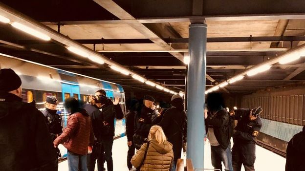 Полицейские обыскивают россиян в метро перед матчем Швеция - Россия